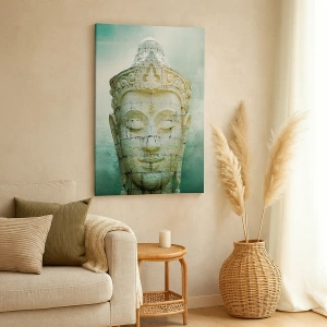- Această imprimare pe pânză înfățișează o statuie a lui Buddha învăluită într-o ceață delicată pe un fundal verde. Perfectă pentru interioare inspirate de armonie și spiritualitate.