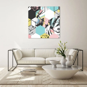 Tablou pe sticlă - Hexagoane și cuburi în șase culori - 40x40 cm