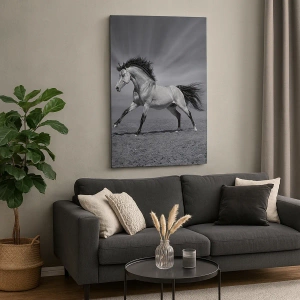 - imprimare pe pânză alb-negru care înfățișează un cal dinamic pe un fundal deșertic, conferind interiorului eleganță și putere expresivă.