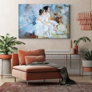 - Pictura înfățișează două balerine în costume albe, relaxându-se pe un fundal pastelat. Subtilitatea și eleganța acestei lucrări aduc armonie și o atmosferă rafinată interiorului, completând perfect aranjamentele clasice.