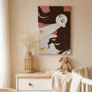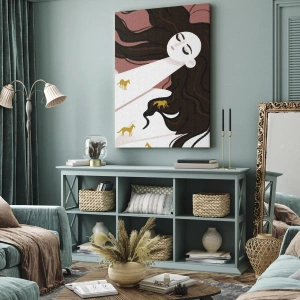 - Pictura înfățișează o figură cu ochii închiși, înconjurată de cai aurii, odihnindu-se pe un fundal deschis la culoare și fiind înconjurată de un păr șaten delicat. Efectul general este cel al artei contemporane, surprinzând armonia și subtilitatea moti...
