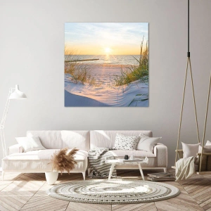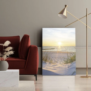 Tranziția de la dune la mare este plină de detalii - urme de pași în nisip, umbre delicate ale ierbii și reflexia luminii în apă subliniază frumusețea naturală a acestui peisaj. Imaginea atrage privirea și creează o atmosferă de pace și armonie, ideală ca decor interior.