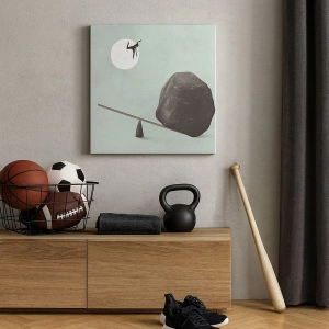 - Această pictură înfățișează un echilibru simbolic, prezentând o figură și o stâncă pe un cer luminos. Perfectă pentru interioare moderne. Imprimeul pe pânză măsoară 70x50 cm.