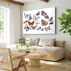 - Această imprimare pe pânză înfățișează o colecție de fluturi colorați pe un fundal alb, subliniind frumusețea naturii și subtilitatea formei. Perfectă pentru interioare elegante și luminoase.
