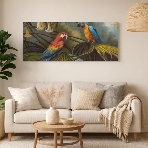 - Această imprimare colorată pe pânză, de 70x50 cm, înfățișează papagali într-o pădure tropicală pe un fundal de flori exotice. Un plus perfect pentru orice interior, aduce o atmosferă tropicală și o armonie unică.