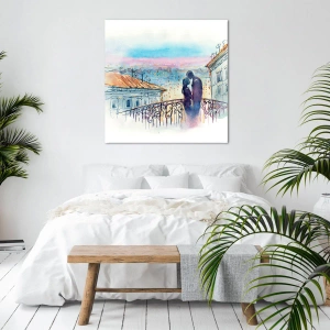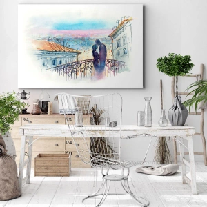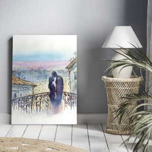 - Pictura înfățișează o scenă în acuarelă a unui cuplu romantic pe un balcon cu vedere la oraș, perfectă pentru interioare pline de subtilitate și inspirație.