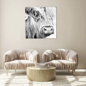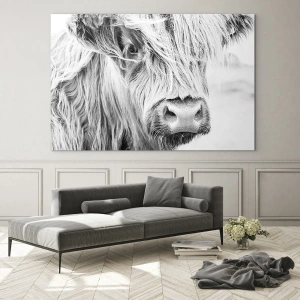 Tablou pe sticlă - Prim-plan al unei vite scoțiene cu păr lung, în alb și negru - 70x50cm - Sălbăticie scoțiană - Decorațiune modernă pentru perete pentru living și dormitor ARTTOR