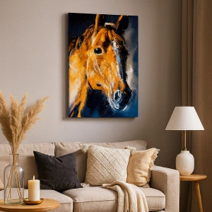 • Această pictură înfățișează portretul unui cal într-un stil dinamic, pictural. O decorațiune elegantă care adaugă o notă distinctivă și artistică oricărui interior.