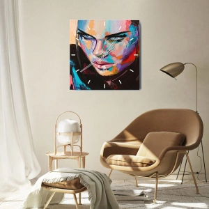 - Acest ceas prezintă un portret intens, abstract al unei femei, pictat în nuanțe vibrante și colorate. Perfect pentru interioare moderne și artistice.