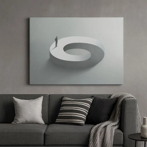 - Această pictură înfățișează un bărbat stând pe o structură gri, abstractă. Perfectă pentru interioare minimaliste, introduce reflecție și subtilitate.
