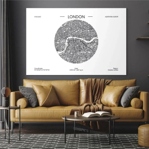 Tablou pe sticlă - O hartă detaliată a Londrei, în stil grafic alb-negru. - 70x50cm - Anatomia Londrei - Decorațiune modernă pentru perete pentru living și dormitor ARTTOR