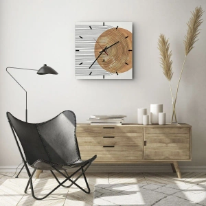 Ceas de perete - Ceas pe sticlă - Lemn și linii pe un fundal deschis în armonie geometrică - 30x30cm - Compoziția solară - Decorațiune modernă pentru perete pentru living, bucătărie și dormitor ARTTOR