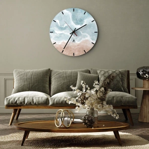 - Acest ceas de perete prezintă o abstracție pastelată care amintește de cer și nisipul de pe malul mării. Decorat în nuanțe delicate de albastru și bej, aduce armonie și o notă artistică subtilă oricărui interior.