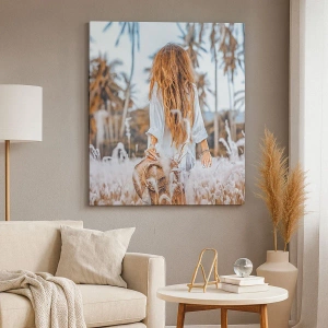 Tabloul „Femeie într-un câmp cu iarbă cu palmieri în fundal la apus” este o decorațiune unică pe pânză cu dimensiunea de 70x50 cm, în format orizontal. Reprezintă o femeie mergând într-un câmp cu iarbă cu palmieri în fundal, surprinsă în lumina soarelui care apune. Această scenă pitorească în stil **boho** aduce armonie, pace și o atmosferă de vară în interior.