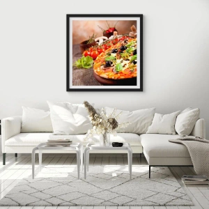 Poster în ramă neagră - Pizza cu măsline și ierburi aromatice cu ingrediente proaspete - 50x70cm - Din ingredient teluric - Decorațiune modernă pentru perete pentru living și dormitor ARTTOR