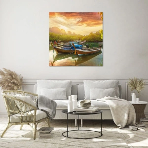Tablou pe sticlă - Bărci tradiționale într-un peisaj tropical la apus - 70x50cm - Înainte de o zi plină - Decorațiune modernă pentru perete pentru living și dormitor ARTTOR
