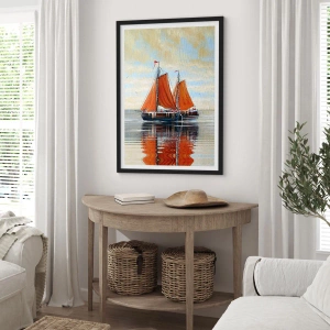 Tema nautică a posterului reflectă pacea și frumusețea naturii, creând un element decorativ unic. Velele roșii adaugă expresivitate, în timp ce reflexiile subtile în apă subliniază caracterul artistic al imaginii.