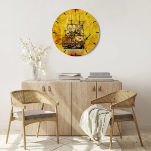 - Motivul grafic cu o corabie cu pânze pe un fundal auriu creează o compoziție decorativă clasică și elegantă. Acest ceas rotund este perfect pentru interioarele vintage sau în stil nautic.