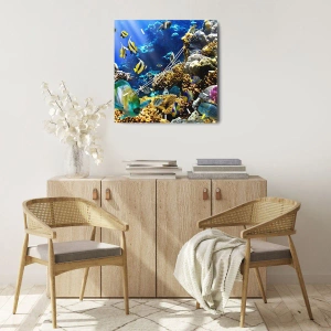 Nuanțele dominante de albastru, auriu și culorile peștilor tropicali creează o compoziție incredibil de armonioasă și relaxantă. Motivul recifului de corali înviorează orice interior, oferindu-i un caracter unic și subliniindu-i individualitatea. Este decorațiunea perfectă pentru un living, dormitor sau spațiu de relaxare, inspiratoare și încântătoare.