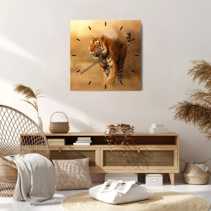 Ceas de perete - Ceas pe sticlă - Un tigru pe fundalul unei pajiști aurii - 30x30cm - Înainte de atac - Decorațiune modernă pentru perete pentru living, bucătărie și dormitor ARTTOR
