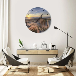 • Acest ceas de perete rotund prezintă o imagine a unei plaje și a dunelor la apus. Un plus subtil și elegant pentru interioarele inspirate de natură.