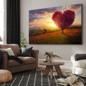 Tabloul pe pânză „Copac în formă de inimă la apus” este o decorațiune unică ce emană o atmosferă romantică și frumusețea naturii. Elementul central al compoziției este un copac cu frunze într-o nuanță de roșu intens, format în formă de inimă, ceea ce face ca această priveliște să fie extrem de simbolică și unică. Fundalul tabloului prezintă soarele apus, care luminează cerul cu culori calde, adăugând profunzime și armonie întregii scene.