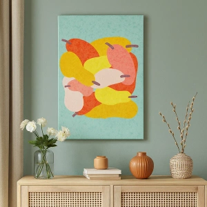 Imprimeul pe pânză „Încercați Soarele de Vară” este o decorațiune modernă care va înviora orice interior. Reprezentarea abstractă a fructelor, cu culorile sale calde dominante de galben, portocaliu și roz, contrastează cu fundalul verde rece, creând o compoziție eficientă.