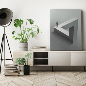 - Pictura înfățișează o figură stând pe un triunghi Penrose, creând o iluzie optică. Decorată în tonuri minimaliste de gri, simbolizează modernitatea și armonia abstractă, ideală pentru interioarele contemporane.