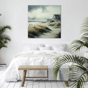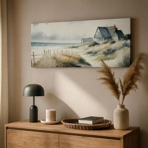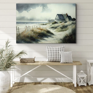 Tablou pe pânză Canvas - O casă la malul mării înconjurată de iarbă și cu vedere la mare - 70x50cm - Departe de agitație - Decorațiune modernă pentru perete pentru living și dormitor ARTTOR