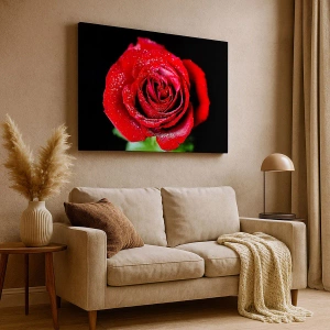 Tablou pe pânză Canvas - Un trandafir roșu acoperit cu picături de rouă pe un fundal negru. - 70x50cm - Pur și simplu dragoste - Decorațiune modernă pentru perete pentru living și dormitor ARTTOR