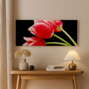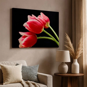 Tablou pe pânză Canvas - Lalele roșii cu picături de rouă pe fundal negru - 70x50cm - Promisiunea unei iubiri pure - Decorațiune modernă pentru perete pentru living și dormitor ARTTOR