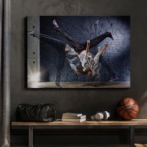 „Steaua străzii” este o imprimare pe pânză care înfățișează o scenă de dans dinamică cu un dansator în plină mișcare. Surprinsă sărind pe un zid de cărămidă și luminată intens de spoturi, imaginea surprinde energia, ritmul și expresia dansului stradal. Efectele vizuale accentuează mișcarea, creând un sentiment de fluiditate și lejeritate.
