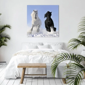 Tablou pe pânză Canvas - Un cal alb și unul negru galopând prin zăpadă - 70x50cm - Galop de alb și negru - Decorațiune modernă pentru perete pentru living și dormitor ARTTOR