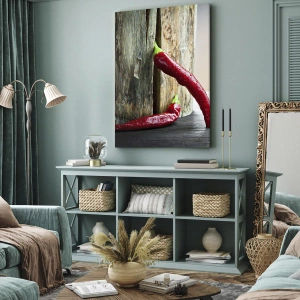 Tablou pe pânză Canvas - Doi ardei iute roșii pe un fundal de lemn cu accent rustic - 70x50cm - Red hot chili peppers - Decorațiune modernă pentru perete pentru living și dormitor ARTTOR