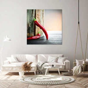 „Ardei iuți roșii” este o pictură originală pe pânză care înfățișează doi ardei iuți roșii așezați pe un fundal rustic de lemn. Roșul intens al ardeilor contrastează cu nuanțele naturale ale lemnului, conferind picturii un caracter distinct și cald. Acest motiv se potrivește perfect într-o bucătărie sau o sufragerie, adăugând prospețime și energie interiorului.