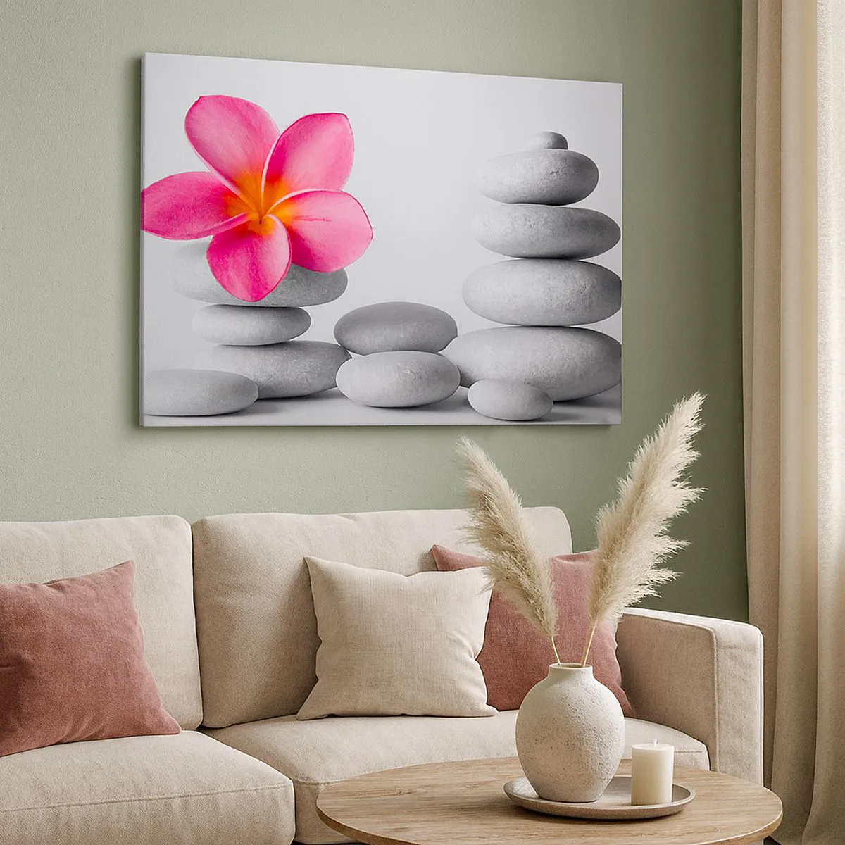 Tabloul „Floare roz pe pietre Zen” prezintă o compoziție delicată ce se potrivește perfect filosofiei armoniei și echilibrului. Punctul focal este o floare roz, care contrastează cu pietrele gri, simbolizând pacea și liniștea.
