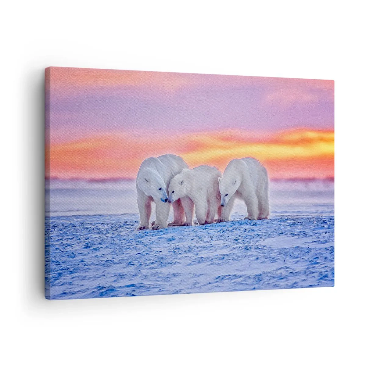 Căldura familiei este suficientă este o pictură extraordinară care înfățișează trei urși polari pe fundalul unui apus arctic pitoresc. Această scenă combină măreția naturii sălbatice cu subtilitatea unui peisaj de iarnă, creând o armonie plină de pace și inspirație.