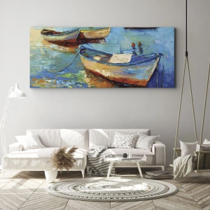Tabloul pe pânză „Bărci colorate ancorate pe ape calme” este o operă de artă care aduce pace și armonie unui interior. Motivul central al compoziției îl reprezintă bărcile colorate care plutesc pe suprafața calmă a apei, înconjurate de reflexii delicate de lumină și reflexii colorate. Culorile, dominate de nuanțe de albastru, galben și roșu, creează un întreg dinamic, dar calm.