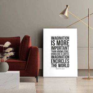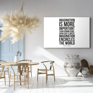 Tabloul pe pânză „Citat inspirațional pe fundal alb cu font negru” este decorațiunea perfectă pentru iubitorii de minimalism și accentele motivaționale. Elementul central este un citat distinctiv cu font negru, care iese în evidență pe un fundal alb simplu. Citatul „Imaginația este mai importantă decât cunoașterea. Cunoașterea este limitată. Imaginația înconjoară lumea” de Albert Einstein inspiră gândirea și acțiunea creativă.