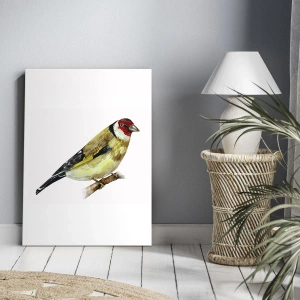 Tabloul pe pânză „Portret de pasăre” înfățișează o pasăre fermecătoare cu capul roșu cocoțată pe o creangă delicată. Culorile sale naturale - galben, roșu și negru - contrastează cu fundalul deschis, minimalist, subliniind frumusețea motivului. Realizată în stil acuarelă, pictura combină subtilitatea cu o expresie artistică ce atrage atenția.