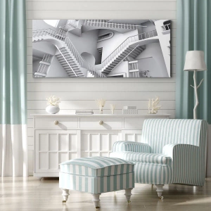 - O compoziție suprarealistă de scări care formează un spațiu abstract. Această pictură monocromatică este perfectă pentru interioarele moderne.