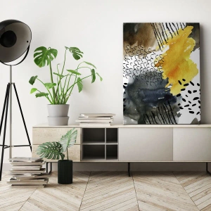 Tablou pe pânză Canvas - O compoziție abstractă cu accente galbene și modele grafice. - 70x50cm - O întâlnire a elementelor - Decorațiune modernă pentru perete pentru living și dormitor ARTTOR