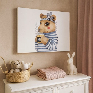 Tablou de perete - Ursuleț dulce - Ursuleț de pluș într-un pulover cu dungi și o cană de miere