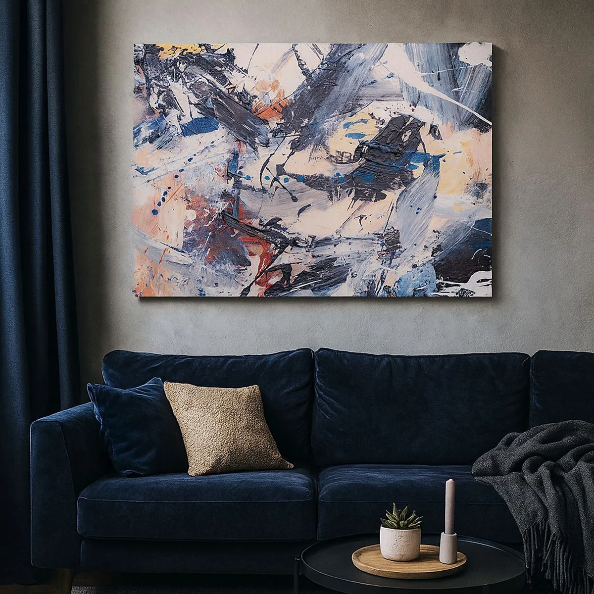 Dansul nebun al abstracțiunii este o pictură plină de expresivitate, înfățișând pensule dinamice în nuanțe de albastru, roșu și alb. Acest motiv abstract încântă prin energia și claritatea sa, perfect potrivit pentru interioarele contemporane.