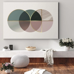 Cerc în spatele unui cerc… este o imprimare pe pânză de 70x50 cm care înfățișează o compoziție abstractă de forme geometrice în nuanțe pastelate de verde și roz, completate de linii aurii. Designul său modern conferă interiorului un caracter și o eleganță unice.