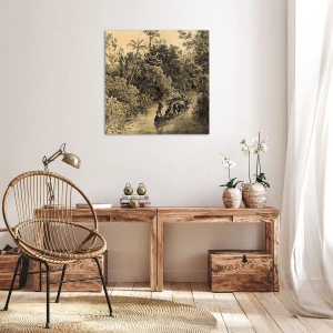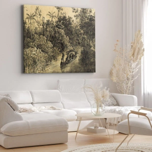 Această imprimare pe pânză de 70x50 cm, intitulată „Expediție la Sursă”, înfățișează un desen artistic al unei jungle tropicale cu o barcă pe un râu calm. Compoziția, executată în tonuri sepia și într-un stil vintage, introduce în interior o atmosferă unică și o profunzime inspirată de natură.