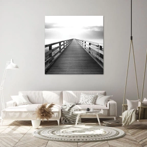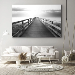 Tablou pe pânză Canvas - imagine alb-negru a unui debarcader din lemn care duce spre orizont. - 70x50cm - Departe, departe... - Decorațiune modernă pentru perete pentru living și dormitor ARTTOR