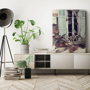 Tablou pe pânză Canvas - Biciclete vintage în fața unei uși de lemn cu obloane pastelate - 70x50cm - Trăiască provincia! - Decorațiune modernă pentru perete pentru living și dormitor ARTTOR
