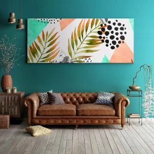 - Acest tablou prezintă un model tropical cu frunze și forme geometrice în culori pastelate. Este accentul perfect pentru interioarele moderne și artistice.