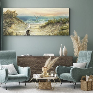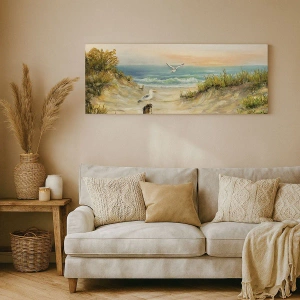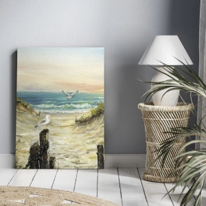 - O imagine pitorească a coastei, a pescărușilor și a dunelor de nisip în lumina caldă a apusului. Culorile delicate ale naturii creează un sentiment de pace și armonie, perfect pentru decorarea interioară.